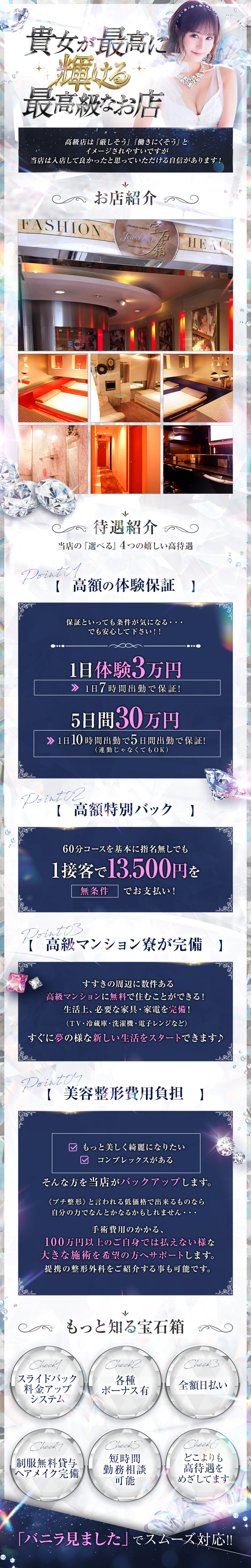 宝石箱のゴッチです!本日もブログをご覧いただき有難う御座います♪今日のお題はこちら!【これから初めて風俗で働く女性へアドバイスをお願いします。】こちらについてお答えしたいと思います。自分から言えるのは『無理せず頑張って下さい』この一言でしょうか。風俗は自分の頑張り次第で沢山稼ぐことが出来ます。ですが体調が優れないやメンタルがやられて頑張れないという女の子もいるのが事実です。言い方が悪い表現かもしれませんが自分自身が仕事道具であるので無理だけは決してしないでください。具合が悪かったら休んで構いませんし、メンタルがやられて話を聞いて欲しいなどがあればスタッフや周りの友人に愚痴をこぼして少しでもスッキリしてください。我々スタッフは皆さんの味方です。このブログをご覧になってる初めて働く方、すでに働いてる方の励みになったら嬉しいです。今日はここまでです!また次回のブログでお会いしましょう!!【お給料の目安】日給60,000円以上可能!あなたの頑張り次第ではそれ以上も全然稼げます!!【勤務日】月1回、週1回からお仕事可能です。他の記事に書いたように自分のタイミングで働けますのでプライベートも充実させつつ働くことが出来ます!【勤務時間】早番:9時~17時遅番:17時~24時基本的な出勤時間は上記のものですがもう少し短くとか例として11時~15時までなども可能です。そこは随時ご相談頂ければと思います。また上記以外にもボーナスや特典もあります!・写メ日記を一定数投稿するとお給料に+α・全額お給料は日払い制・ドレスやヒールは無料で貸し出し・無料送迎あり・完全個室待機・生理休暇や長期休暇も可能ススキノ屈指の広く清潔感溢れるお部屋ですので女の子が働きやすい環境を整えております!この内容を見て少しでも興味が出たら是非お問い合わせください!!是非、スタッフ一同お待ちしております!