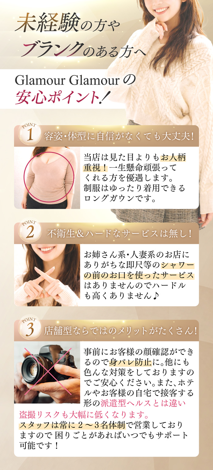 ご質問有難うございます。 GlamourGlamour店の在籍女性は 現在まで働かれていた方 3割 ブランクがある方 3割 風俗経験が全くない方 3割 となっております。 経験がないと何を聞けばいいかもわからないですよね。 まずは店舗見学がてら面接にお越しください。 店舗のサービスや設備などを見て頂き 一度持ち帰って頂いてから、 実際に働くかどうかを考えいただければ幸いです。 GlamourGlamour
