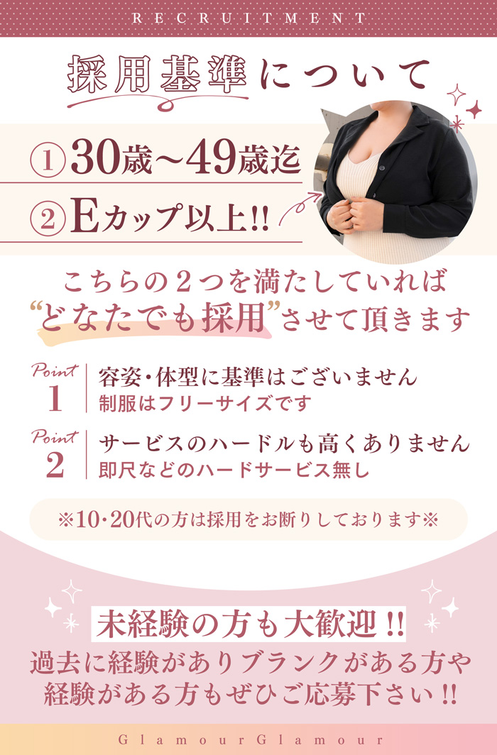 お問い合わせ有難うございます GlamourGlamour店は巨乳専門店となります。 スリムな方よりもふくよかな女性が在籍には多く 制服に関しても最大5Lサイズまでの余裕のあるものを ご用意しております。 容姿よりもお客様に対しての 接客意識が大事になってくるものです。 外見での採用基準は設けておりませんので 気になされずにぜひご応募をいただければ幸いです。 GlamourGlamour