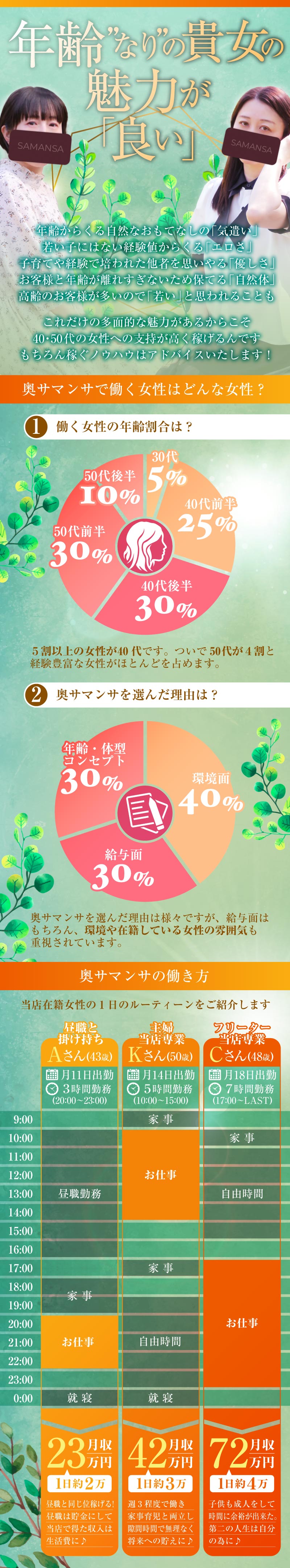 【20代後半〜40代】の女性大歓迎です! 当店は「大人の女性がソフトサービスでも稼げる」お店をテーマに営業しています! 20代後半・30代・40代前半で求められるのはハードなサービス?答えはNOです♪ 当店は、即サービスや性器を使うサービスは一切なし! 実際に当店の女性たちは「ムリなくハードなサービス一切なしで稼いでいます!」 可愛いフリフリは、もぉムリ!でもハードなサービスはイヤ…でも稼ぎたい!!!そんな女性を大募集♪ 既婚・未婚問わず大募集|容姿不問|体型不問|帝王切開跡あってもOK|