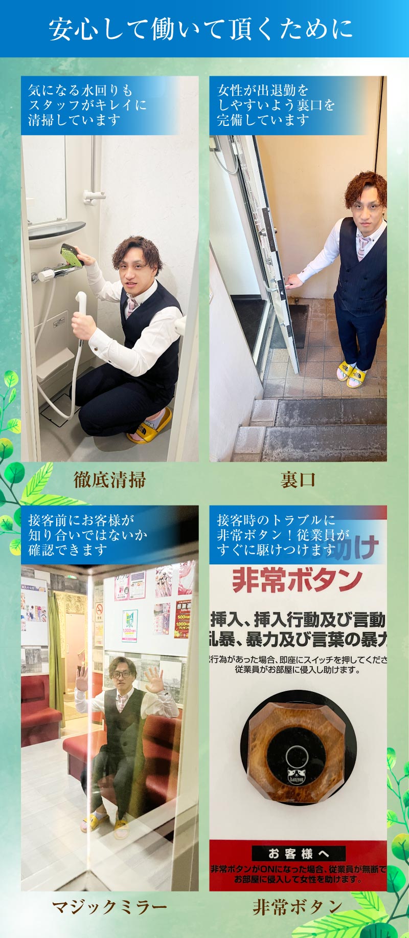 ・体験入店はいつでもOK! ・指名ボーナス制度があります ・罰金や預かり金、ノルマはありません ・顔出しの強要はしません ・シフトは自己申告制です ・経験の有無は問いません ・全部屋シャワー完備 ・備品はお店で用意しております ・便利な定期検診の実施 ・マンション寮(家具付き)があります ・託児所ご紹介します ・アリバイ会社あり ・感染症対策徹底中 ・お部屋には緊急ボタンがあります |