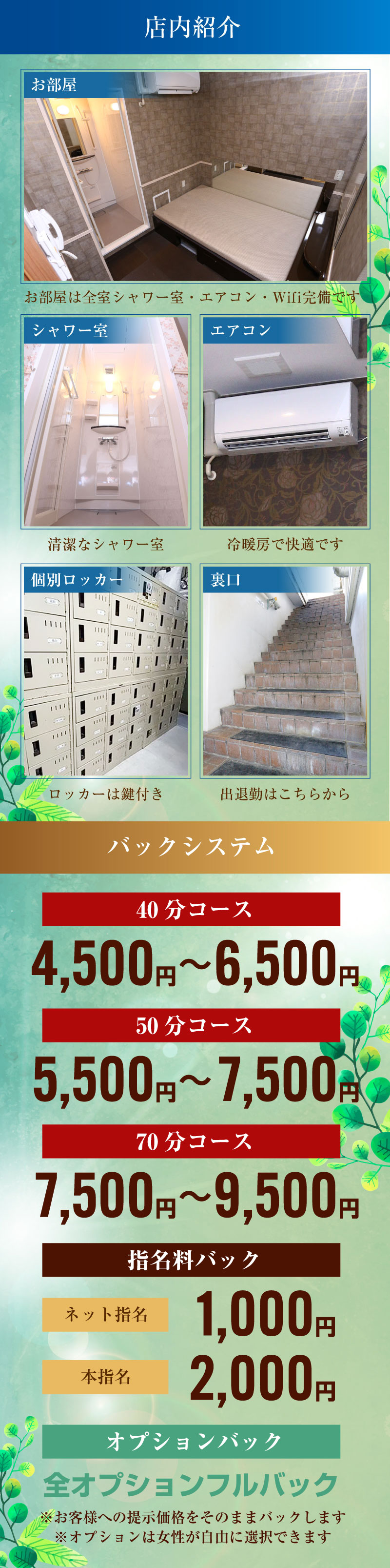 40分→4,500円 50分→5,500円 60分→6,500円 70分→7,500円 その他、本指名・ネット指名バックやオプションバックがあります。 ※60分13000円、80分18000円と高額バックのコースもあり!!