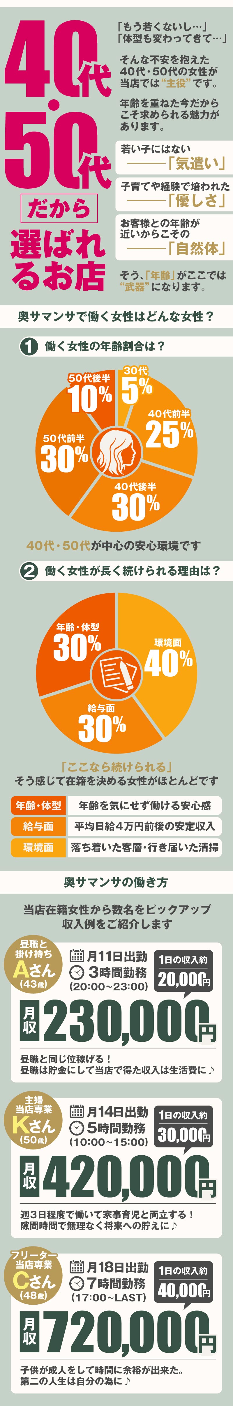 在籍の9割は40代から50代!事情に合わせた働き方をサポート40代から50代のキャストさんが9割を占める同店。“○うち”さんは「面接では大人の女性ならではの包容力を重視しています」と教えてくれました。また、シフトの融通が利く点も魅力。プライベートを優先しながら合間にお仕事したり、フルタイムで出勤して高収入を目指すなど、自分に合った働き方ができるそうです。