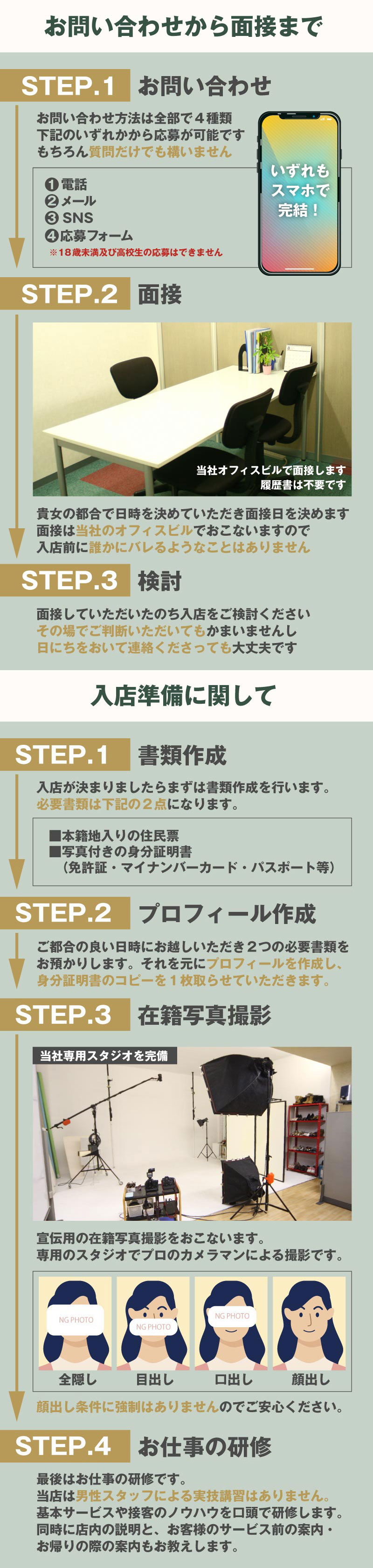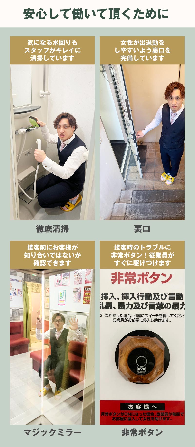 ・体験入店はいつでもOK! ・指名ボーナス制度があります ・罰金や預かり金、ノルマはありません ・顔出しの強要はしません ・シフトは自己申告制です ・経験の有無は問いません ・全部屋シャワー完備 ・備品はお店で用意しております ・便利な定期検診の実施 ・マンション寮(家具付き)があります ・託児所ご紹介します ・アリバイ会社あり ・感染症対策徹底中 ・お部屋には緊急ボタンがあります |