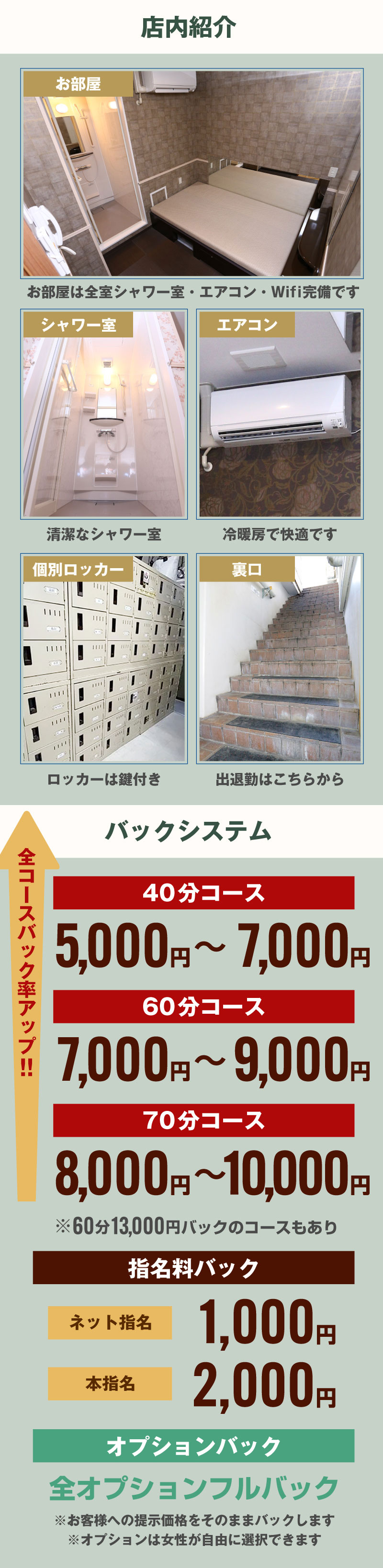 40分→5,000円 50分→6,000円 60分→7,000円 70分→8,000円 その他、本指名・ネット指名バックやオプションバックがあります。 ※60分13000円、80分18000円と高額バックのコースもあり!!