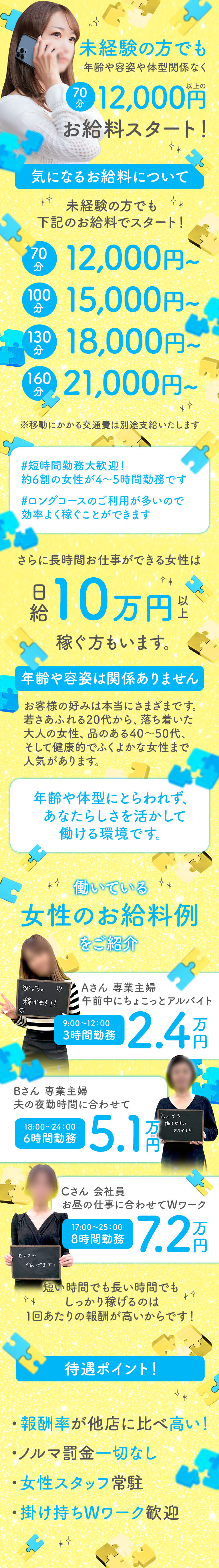 70分¥12,000 100分¥15,000 130分¥18,000 160分¥21,000 即会い.netでは一番短い70分のコースでも ¥10,000を超えるお給料となっております(*^^*) だから時間の無いシングルマザーの方も ダブルワークの方も空いたお時間でサクッと稼げるんです( *´艸`)