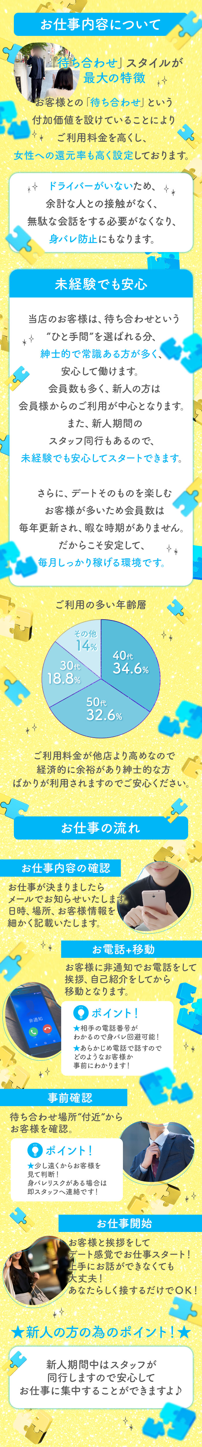 ■当店17年の大手老舗店舗となっております。 お客様も紳士的な方が多くお仕事しやすい環境です。 ■身バレ対策:どのお店でも相当なリスクはあると思いますが当店は独自の身バレ対策がございます。 ■年齢・体型不問:お店が求めてるのは『清潔感がある一般的な女性』です。 ■オペレーターが的確に誘導:方向音痴やマップが苦手な人でも大丈夫! ■女性スタッフが1日中常駐:どの時間帯にも女性スタッフが常駐しております。 ■待機方法自由:ご自宅待機はもちろん、カフェやカラオケ店、商業施設などお好きな場所で自由にお過ごしください。 プライバシーがしっかりと守られる当店ならではの働き方が可能です。 【当店のサポート】 総勢8名と女性スタッフが早番・遅番どの時間帯でも勤務しております。 お仕事のお話からプライベートのお話まで1日中サポートいたします。 【お客様の雰囲気】 他店と違い富裕層が多いです。当店は17年の実績があり、お客様には必ず個人情報を教えて頂いておりますので一度もトラブルはありません。