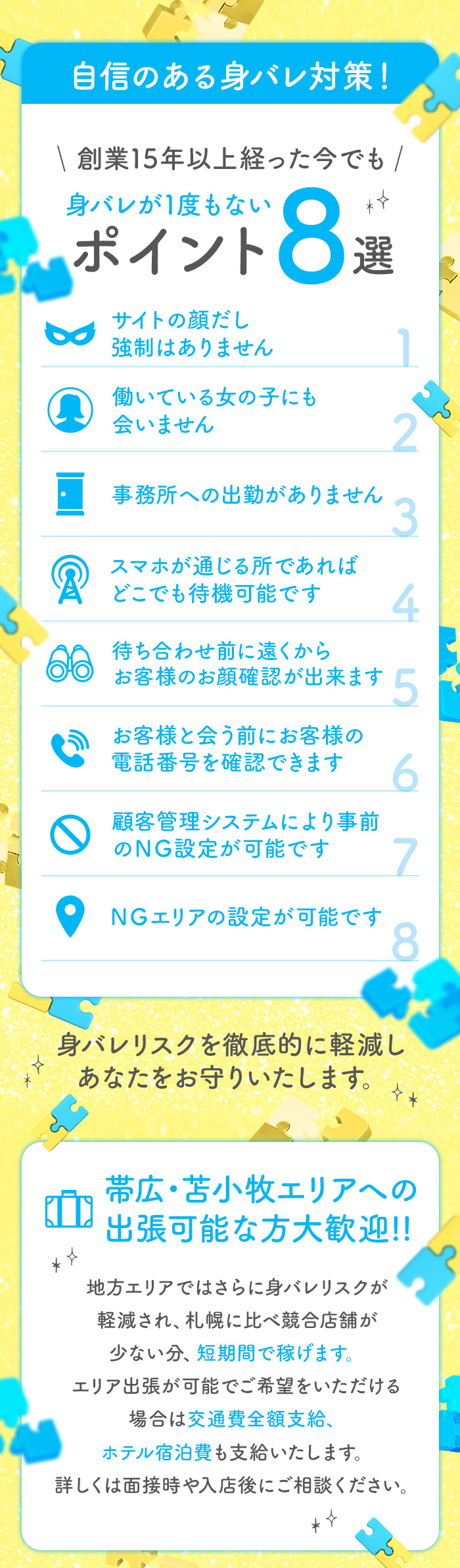 このお仕事をしていることが家族や知人にバレないようにしてくれるシステムだよ!対策方法はお店によってちがうみたいだけど、普通の職場で働いているふりをして電話に取り次いでくれたり、給料明細の発行社名を変えてくれたりなどの対策をしてくれるよ♪