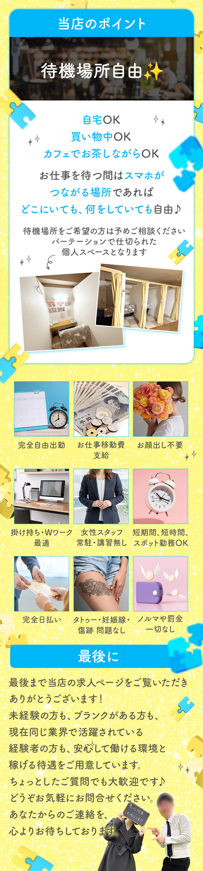 当店では個室待機所がありますのでご安心くださいm(__)m また自宅待機も可能なので自由に働く事が出来ます!