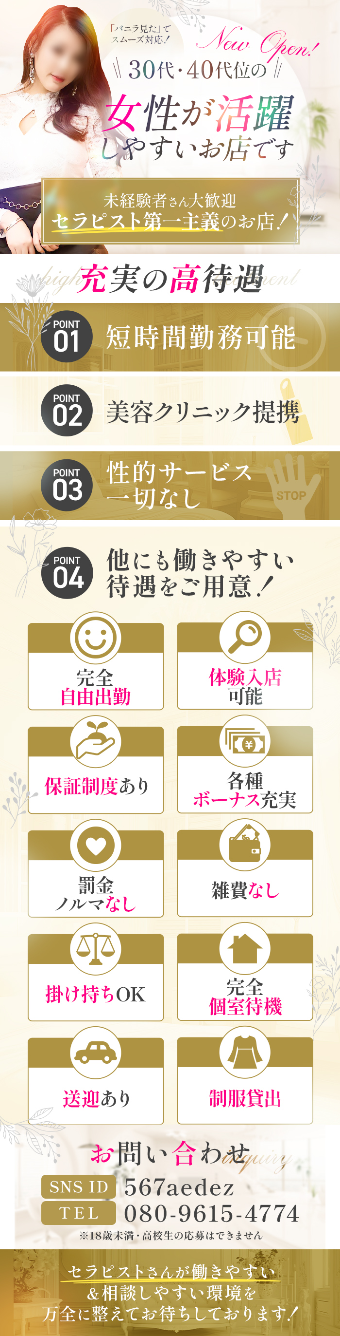 ・資格 27歳~55歳くらいまで※未経験者・主婦・シングルマザーさんも大歓迎!・給与出勤すれば日給15,000円以上は9割の方が、持って帰っておられます。・時間10:00~3:00の間で1日3時間程度でも大歓迎です。遅くなった場合でも深夜送迎もありますので、終電を気にする事はありません。・待遇完全全額日払制、アリバイ対策万全、罰金・ノルマの制約ナシ、マスコミ手当有、生理休暇有り、完全個室待機、完全自由出勤制、各種ボーナス有り、お昼の数時間だけでもOK・出勤月1日から何時間でもOK■完全日払い制その日に稼いだお給料はその日のうちに全額お支払い致します。■完全自由出勤都合のいい日・好きな時間帯でお仕事をして下さい。例えば本業の合間に、主婦業の合間に…そういう女性が多数在籍しているんです。月に1日でも構いません。あなたの目標や都合によってスケジュールを組んで下さいませ。■お友達と一緒の面接も可能一人での面接が不安な場合は、お友達と一緒に面接でもOKです!もちろん付き添いの方が一緒に働く気が無くても大丈夫です。お話を聞くだけで帰って頂いて、返事は後日でも全く問題ありません。お気軽に面接にお越し下さい♪■体験入店制度未経験者の方は業界に対する不安があると思います。当然ですが経験者の方も「本当にお店は稼げるの?」「雰囲気や待遇は自分に合うのか?」などを実際に働いてみてから判断してほしいと考えています。お客様一人だけの接客でも大丈夫です。■仕事上の経費は全てお店が負担お仕事の時に必要なオイル・衣装などの備品は全てこちらで準備致します。女性から備品代を頂くことは一切ありません。■生理休暇女性の日はゆっくり休んで下さい。生理が終ってからの出勤でOKです。■退店のトラブルは一切ありません。辞める時は、1ヶ月以上前に言わないと罰金。辞めたい時に辞めさせてくれないなどと言ったことは一切ありません。他店に勤めていた女性から聞いた内容です。当店では退店に対する縛りはございません。当店の自慢の一つに出戻りの女性が多いと言う点です。退店するのにトラブルがあるお店には女性は二度と帰って来ません。メンズエステの仕事は事情があって入店して来る女性がたくさんおられます。そして辞める時も何らかの事情があって辞めていくものだと思います。お店の都合で女性の気持ちを無視した「無理な引きとめ」は一切いたしませんのでご安心下さいませ。■こんな方も大歓迎!!まずはお気軽にご連絡下さいませ!『子供が小さいので、急な発熱などで休まなきゃいけないこともあるかも...』『シングルマザーだけど子供には人並み以上の生活をさせたい...』『週に1日ぐらいしか働けない...』『月末の数時間だけってアリですか?』『1年で本気でしっかり貯めたい!』『旦那に内緒の借金を返済したい』『長くは働けないから短期間である程度の貯金がしたい』『年齢や容姿に自信がない...』『高収入の日払いバイトを探している』などなど上記の相談は当店にお任せ下さい!!あなたの希望・夢・目標の達成を当店では全力でサポートさせて頂きます。