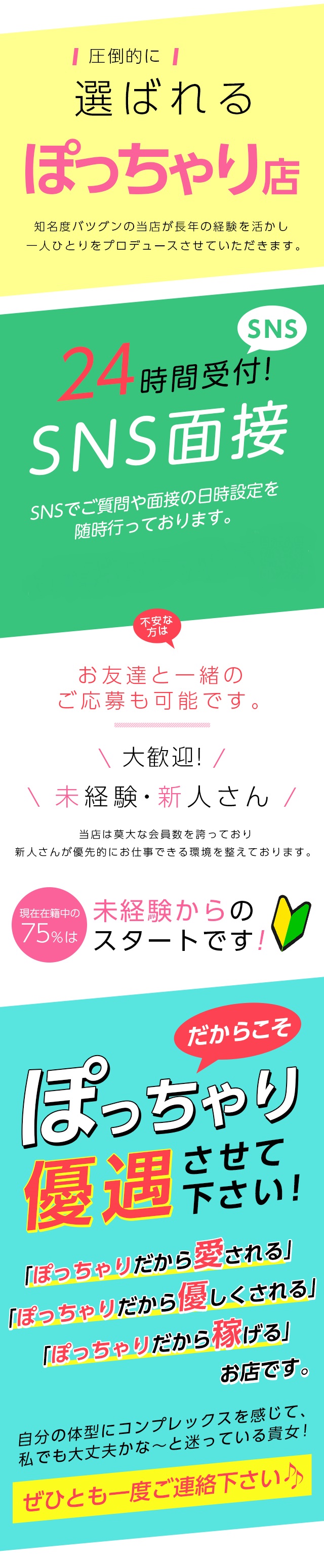 当店のコンセプトは「ぽっちゃり女子によるぽっちゃり女子の為のぽっちゃり専門店」ぽっちゃり体型だけで他店では断られる女の子が多いと聞きます、、、その点で当店はぽっちゃり専門店です^_^体型なんて関係ありません!!!お客様もぽっちゃり好きなお客様ばかりです(^o^)お問い合わせはこちらからLINEID:aisare001メール:aisaregroup@gmail.com電話番号:080-2833-493318歳未満・高校生の応募はできません