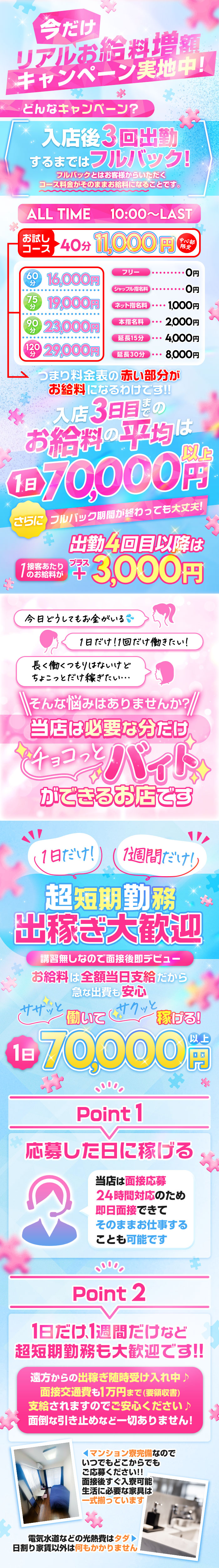 お給料は全額日払い!お試しだからといって、お給料が減らされるなんてことはありません!「お財布の中がすっからかん…明日からどうしよう…」と悩んでいる女の子は、面接→即体験入店で60,000円以上のお給料をその日のうちに持って帰れちゃいますよ(´▽`)