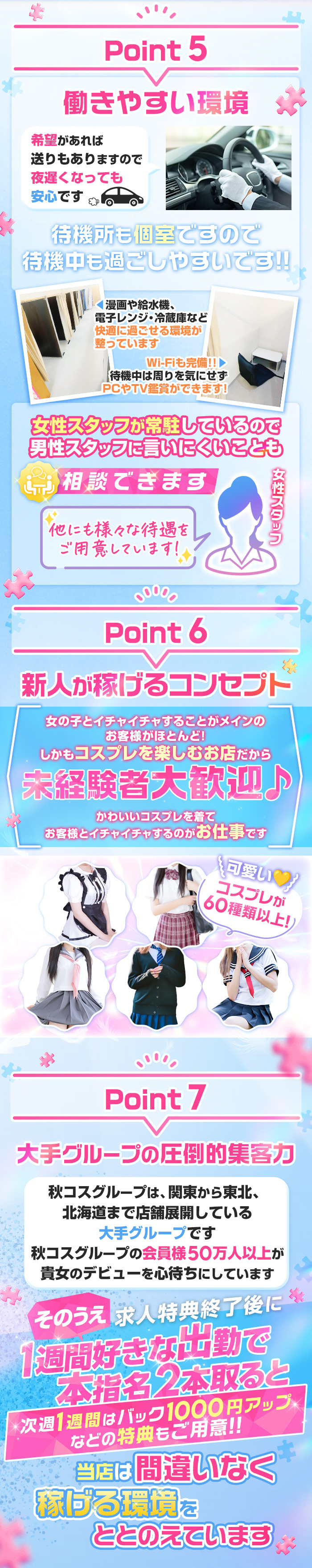完全全額日払い制(体験入店でも)・交通費補助有・各種ボーナス支給・お友達紹介ボーナス・自宅待機可・待機中は近隣への外出可・マンション寮完備・送迎有り・給料明細書、社員証、雇用契約書の発行、定期健診有・罰金、ノルマ一切無し |
