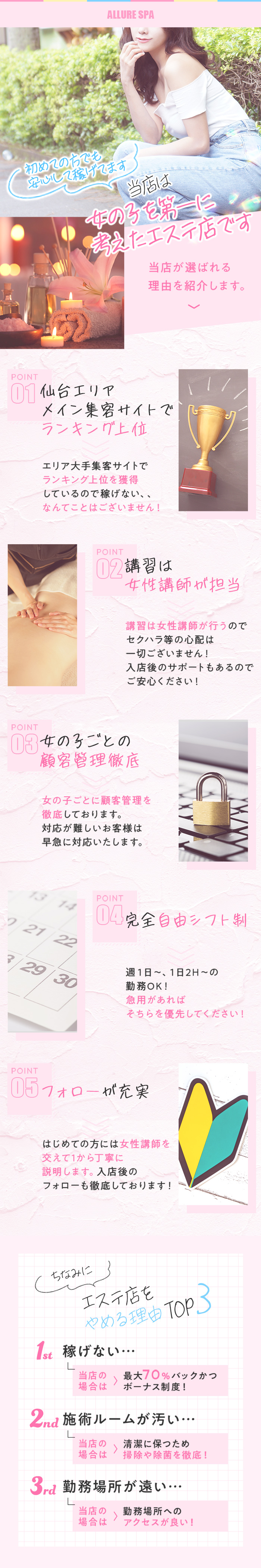 バック、保証、ボーナスが充実!新人研修は女性の講師が担当!同店は20代から30代の女性が活躍しているメンズエステ店で、誰でも稼ぎやすいような高待遇が自慢。スタッフの高瀬さんが、「バックとボーナスが充実しているうえ、新人保証もありますので、経験を問わず安定した高収入が得られます!」と話してくれました。また研修は女性の講師が担当するため安心してほしいとのこと。