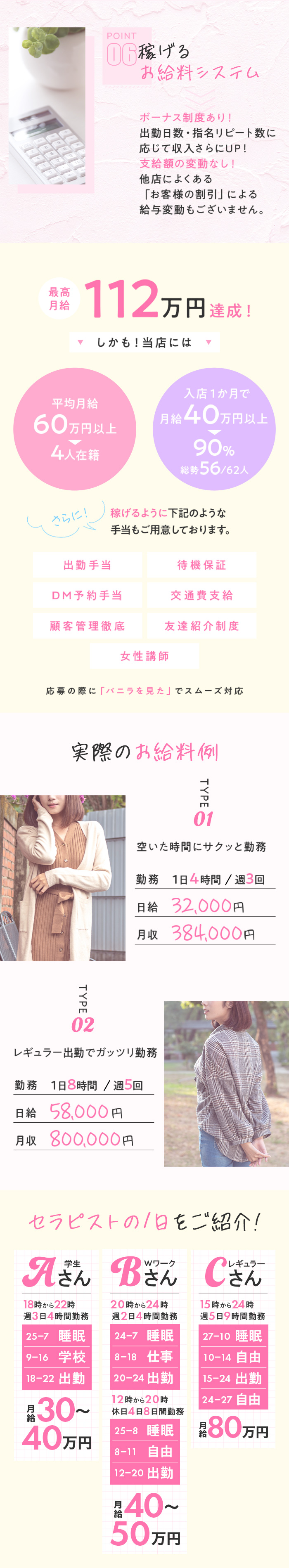 本日は当店セラピストの給与例をご紹介します!【1日の勤務例】Aさん(21歳) 学生さん勤務時間:6時間勤務お仕事件数:3件70分コース 手取り:7000円100分コース 手取り:9000円130分コース 手取り:11,500円*オプションは含まず指名料:1000円~2000円日給:35,000円【月収例】Bさん(24歳)レギュラー出勤勤務時間:1日8時間出勤日数:週5日日給:58,000円月収:800,000円
