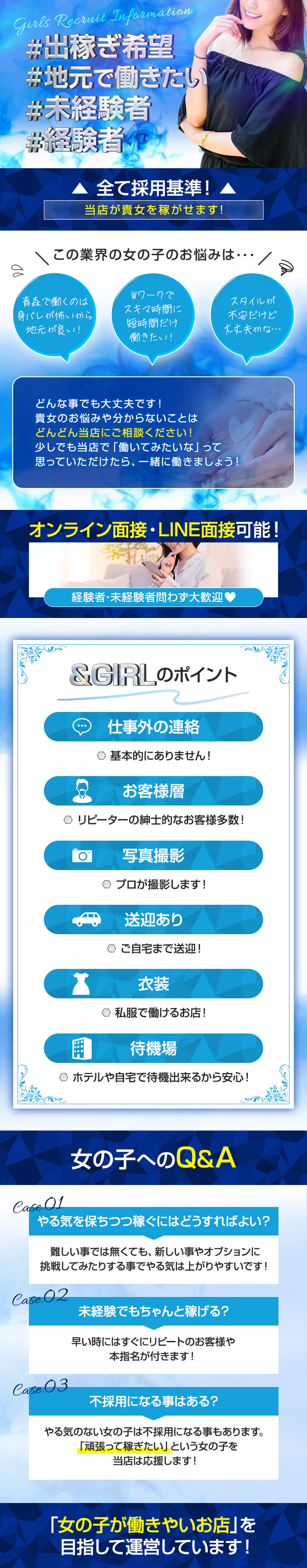 手を使うだけ・見ているだけ・または女の子が受け身にならなくてOKなソフトサービスメインのお店だよ♪初心者の女の子には始めやすいお仕事だね!コースによってサービスの違いがあるお店もあるみたいだから、お仕事内容は事前に聞いてみよう!