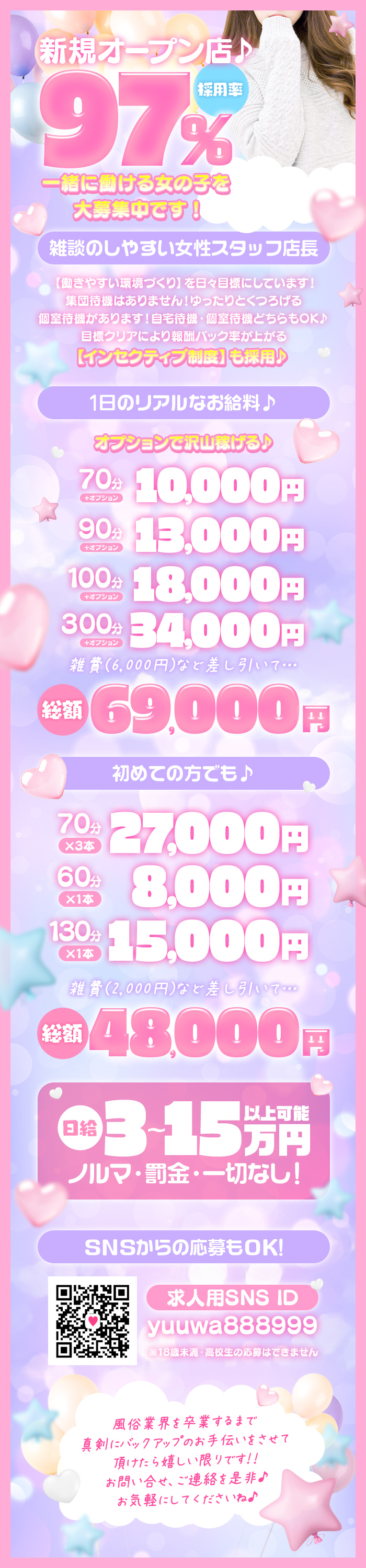 🌟【オープニングキャスト大募集】一緒に楽しく稼げるお店です♪🌟はじめまして!数あるお店の中からご覧いただき、ありがとうございます。当店は、新規オープンにつき《オープニングキャスト》を大募集しています!「働きやすさ」「稼ぎやすさ」「安心のサポート体制」が整っている、清潔感あるお店です。💰お給料について◎60分:8,000円~12,000円◎80分:10,000円~14,000円◎延長:10分ごとに+1,000円もちろん完全日払いOK!頑張り次第で、短時間でもしっかり稼げる環境です♪🏠寮完備!すぐに働ける環境です!遠方の方や、住み込み希望の方も安心!当店では清潔で快適な寮を複数ご用意しています♪寮費もとってもリーズナブル!▶1日1,000円〜2,000円(※頑張りにより変動あり)すぐにお部屋のご案内が可能です!🎁安心の保証制度あり!「最初からちゃんと稼げるか不安…」という方もご安心ください。▶入店から5日間クリアで6万円保証!未経験の方も、優しく丁寧にサポートいたします。働きやすい環境づくりに自信があります!💡諸経費について一律で2,500円のみ。それ以外の引かれるものは一切ありません!🎀こんな方をお待ちしています♪✔ 新しい環境で頑張りたい✔ 短期間でしっかり稼ぎたい✔ 清潔・安全な職場を探している✔ 経験者も未経験者も大歓迎!📞まずはお気軽にお問い合わせください♪・アリバイ会社もある安心店・個人情報や秘密は厳守いたします・無理な出勤やお仕事の強要は一切なし体験入店も大歓迎です!まずは「ちょっと話を聞いてみたい」だけでもOK✨📩 ご応募・お問い合わせはコチラから↓↓【LINE🆔yuuwa888999メール✉️angel01550155@gmail.com電話番号 07083942373 】一緒に楽しく、しっかり稼ぎましょう♪あなたからのご連絡を心よりお待ちしております!
