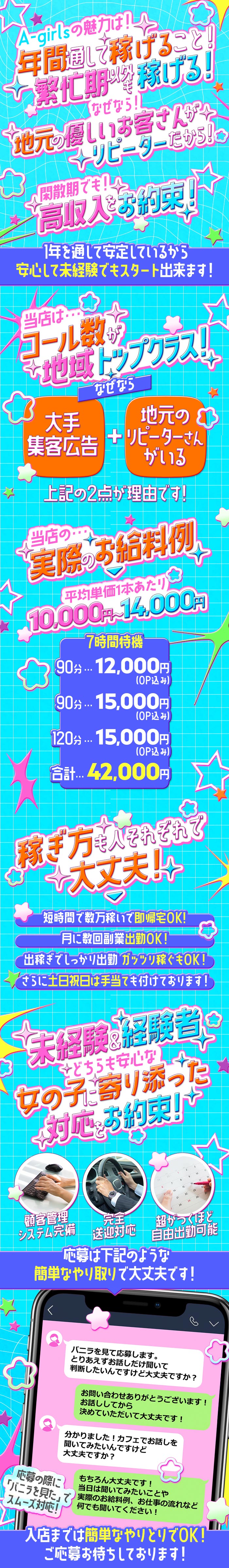 こんにちは!A-girls店長です😊本日は「実際にどれくらい稼げるの?」という質問に、リアルなバック例でお答えしようと思います!💰 ある日のバック実績・待機時間:7時間・90分コース 12,000円(OP込み)・90分コース 15,000円(OP込み)・120分コース 15,000円(OP込み)✨ 合計バック:42,000円! ✨客商売なのである程度は波がありますが無理な本数をこなさなくても、しっかり稼げているのが当店です👍さらに📊 平均単価は10,000円〜14,000円オプションも付きやすく、効率よくお給料に反映されます!さらにさらに…🎉 土日・祝日は手当あり!「週末だけ働きたい」「短時間で稼ぎたい」そんな方にもピッタリです。未経験の方も、経験者の方も、一人ひとりに合った働き方を全力でサポートいたします✨少しでも気になったら、まずはお気軽にお問い合わせくださいね📩あなたからのご連絡、お待ちしております!