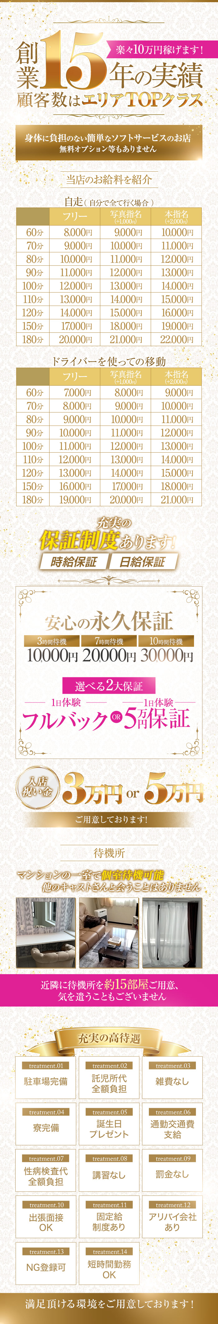 ▼▼☆厚待遇盛り沢山☆▼▼①永久保証制度有り②駐車場完備(お車で通勤でも、駐車場代等の余計な出費ありません)③託児所代お店が全額負担④雑費なし⑤寮完備(遠方からお越しの方でも、出稼ぎの方でもすぐに入居OK)⑥1日体験全額バック(楽々10万は稼げます♪)⑦誕生日プレゼント(5万円までプレゼントします♪現金がいい方は、現金でも是非どうぞ♪)⑧通勤交通費支給(通勤費支給)⑨携帯電話支給(携帯電話がない方は、支給いたします。)⑩性病検査代お店が全額負担(このお仕事するのに1番気になる点だと思います。毎月通っても、当店が全額お支払い致します。)⑪講習なし(業界未経験の子でも、一切ありません。簡単ソフトサービスなので、口頭で全てお伝えしてお仕事スタート出来ます♪※女の子の希望で、絶対講習しなきゃ不安という方は、勿論します。)⑫罰金なし(お店から罰金等は一切引かれません)⑬お客様から貰った交通費代全額バック(ドライバーを使わず、自分でお客様の所にお伺いする子は、コースバック+交通費支給♪♪)⑭紹介料(女の子を紹介してくれた子には、4万円~10万円)支給⑮固定給制度あり(30万・40万・50万・・・・etc月に○日勤務と固定して頂ける子は、固定給30万~色々と選べます。)⑯アリバイ会社有り(実在する会社さんで、給料明細&保育園や市役所に出す書類も、全て対応しております♪)⑰嫌なお客様はシャットアウト(お客様のデータを、管理しておりますので、乱暴な方や、もう付きたくないお客様がいましたら、NG登録でもう2度と、会う事はないです)⑱短時間勤務OK!(1日2〜3時間からの短時間、週1回や不定期の出勤もOK!)⑲面接交通費支給♪ (出張面接ではなく、中央区まで来て頂ける女の子は、実費交通費お渡しいたします♪♪)⑳1人1部屋個別待機(他の女の子に会う事がありません♪)★当店はウソや、出来ない内容は記載しておりません。女の子が、何も不安&不満なくお仕事出来る様に、必ずお約束出来る待遇のみを記載させて頂いています。お仕事も誰でも出来る簡単ソフトサービス♪( 即尺や過剰なサービス、、オプションの強制など一切ありません♪♪ノルマや罰金も一切ありませんので安心して働けます♪♪★未経験者、未婚者、既婚者、妊娠線ある方、短期や出稼ぎ、掛け持ち、等々・・・大歓迎です♪♪20代から40代の女性大募集♪♪働きやすい環境&稼げる様に、完全サポート致します♪♪♪