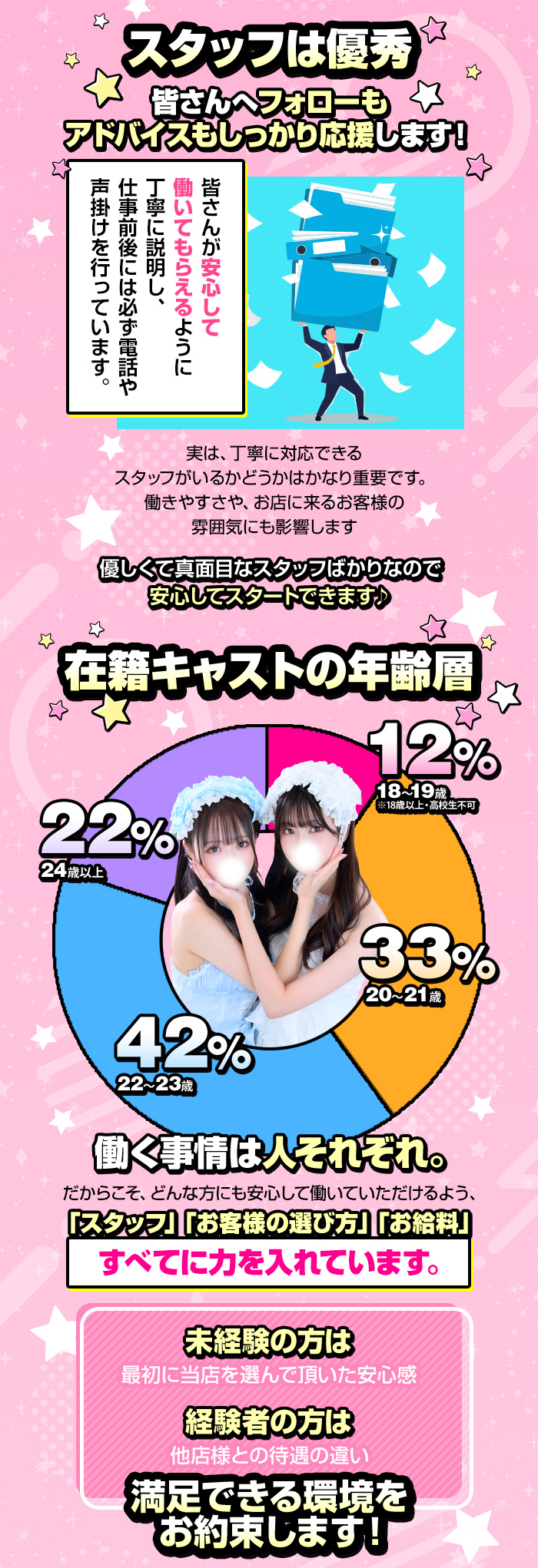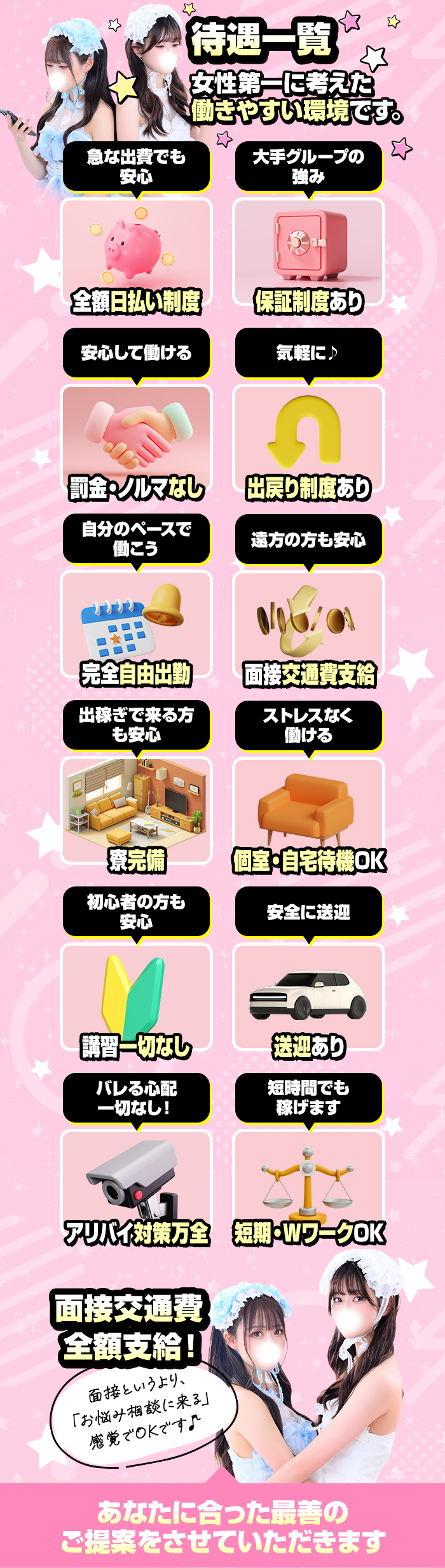 大手グループが経営しているお店だよ。待遇や条件も手厚くて安心だし、集客力もあって女の子が稼ぎやすい!待遇や条件はグループの中でも店舗ごとに変わってくるから、気になるポイントは問い合わせて聞いてみよう♪