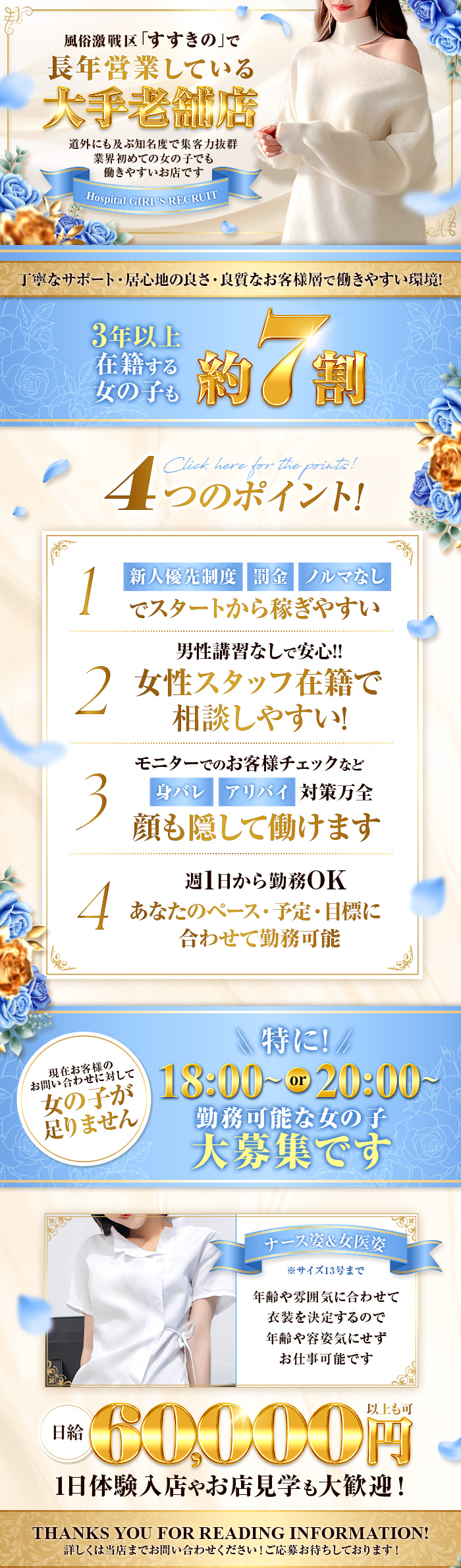 30代・40代も大歓迎!新人優先制度あります。日給6万円以上可能!! 北海道の札幌ススキノで創業約50年の老舗ソープ『病院』は知名度・集客力に自信があります! お客様は札幌近郊や道内外問わずご利用される方がたくさんいます!そのため客足も途切れることがない安定したお店なんです。
