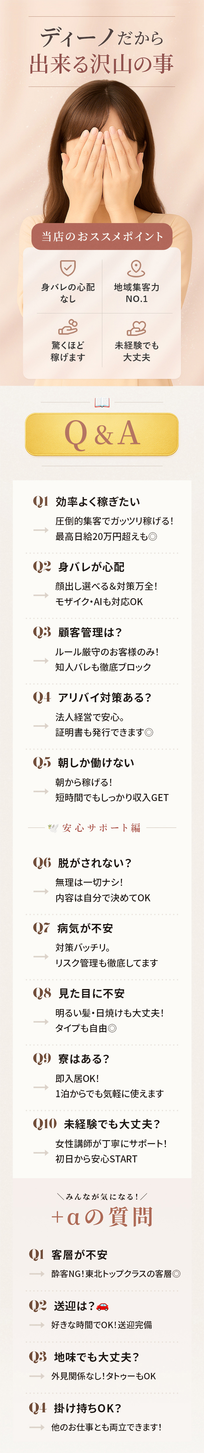Q&A 7選!!Q、自分の容姿に自信がない、、、A、自信を持つって難しいですよね~でも全然気にしなくてOKです!!容姿より、その場の雰囲気を大切に!お客様は重視しております!Q、どのような服装をすればいいの?A、スカート・ワンピース・ショートパンツ等であれば、基本的にはokです!似合う服装が一番良いですよ!!Q、顔だしをしたくないですA、もちろん大丈夫です!!サイト上の写真はご自身にお任せしております。Q、お給料はいつもらえますか!?A、一番聞きたい質問です。当店は、その日に稼いだぶんはその日に渡します。Q、とにかく働きたいです。A、もちろんOKです、最短で出来るようにご対応させて頂きますので、まずはお問い合わせください。Q、月1回でも出勤は可能ですか?A、当店は、完全自由出勤をしていますので、そうゆう所は対応しております!!Q、他のキャストと関わりたくないA、安心してください!当店は個室の待機所を複数用意しておりますのでお気軽にお問い合わせください。まだまだ聞きたい事があると思います!!お気軽にお問い合わせください。