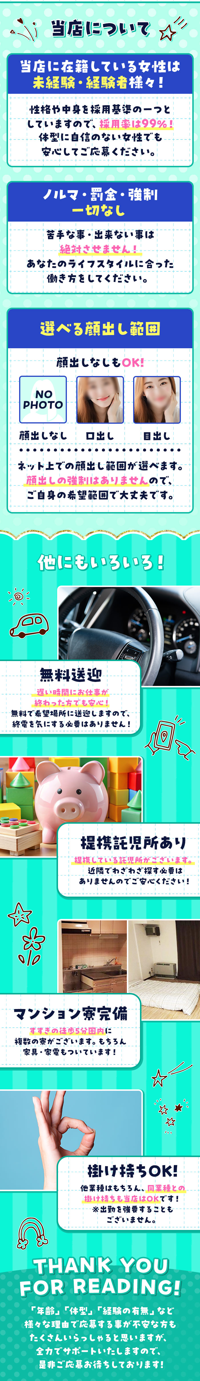 当店はノルマはございません! 女の子がマイペースに頑張って稼げるようにサポートしているので 無理させることはありません!のんびりがんばりましょうね♪