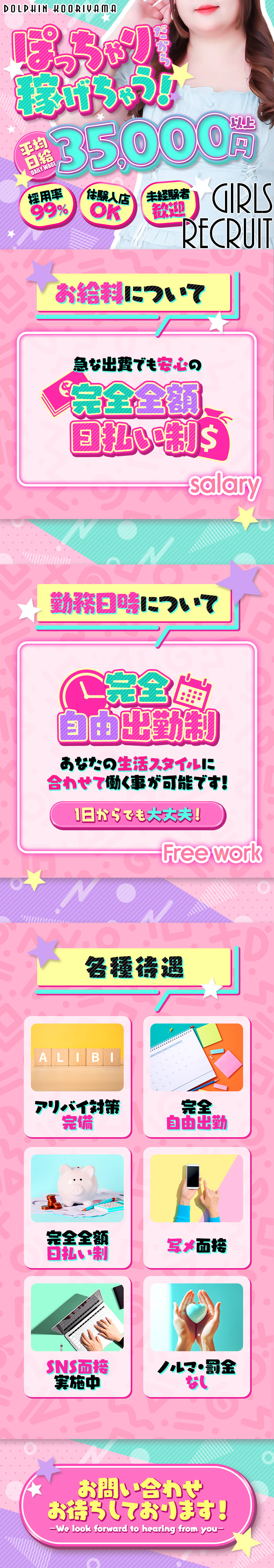 副業やWワークを歓迎しているお店だよ。時間が許す限りガンガン働いていお金を稼ぎたい女の子にはありがたいよね。シフトの入れ方にはお店ごとに決まりがあるから、詳しい条件は問い合わせてみよう♪