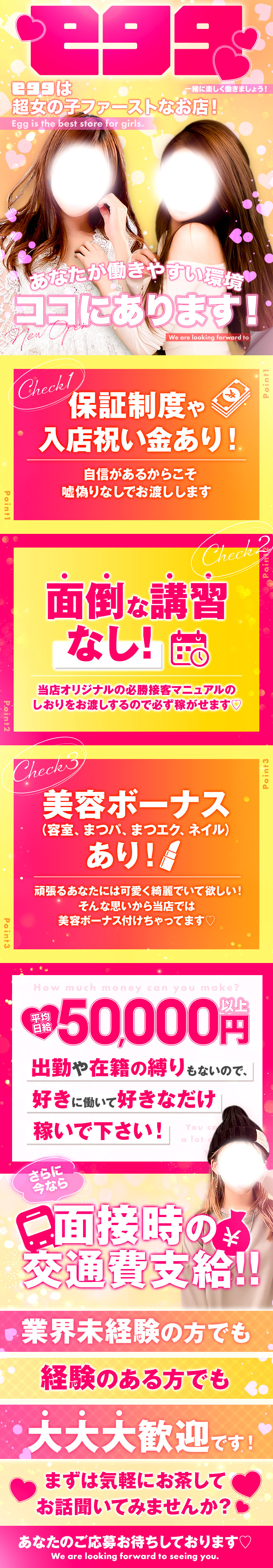 女の子のお仕事に対してノルマや罰金などがないお店だよ♪お店によっては、入店から◯ヶ月以降からはノルマが発生したり、無断欠勤などでは罰金になってしまうなどルールがあったりもするから、入店前にはしっかり聞いてみてね!