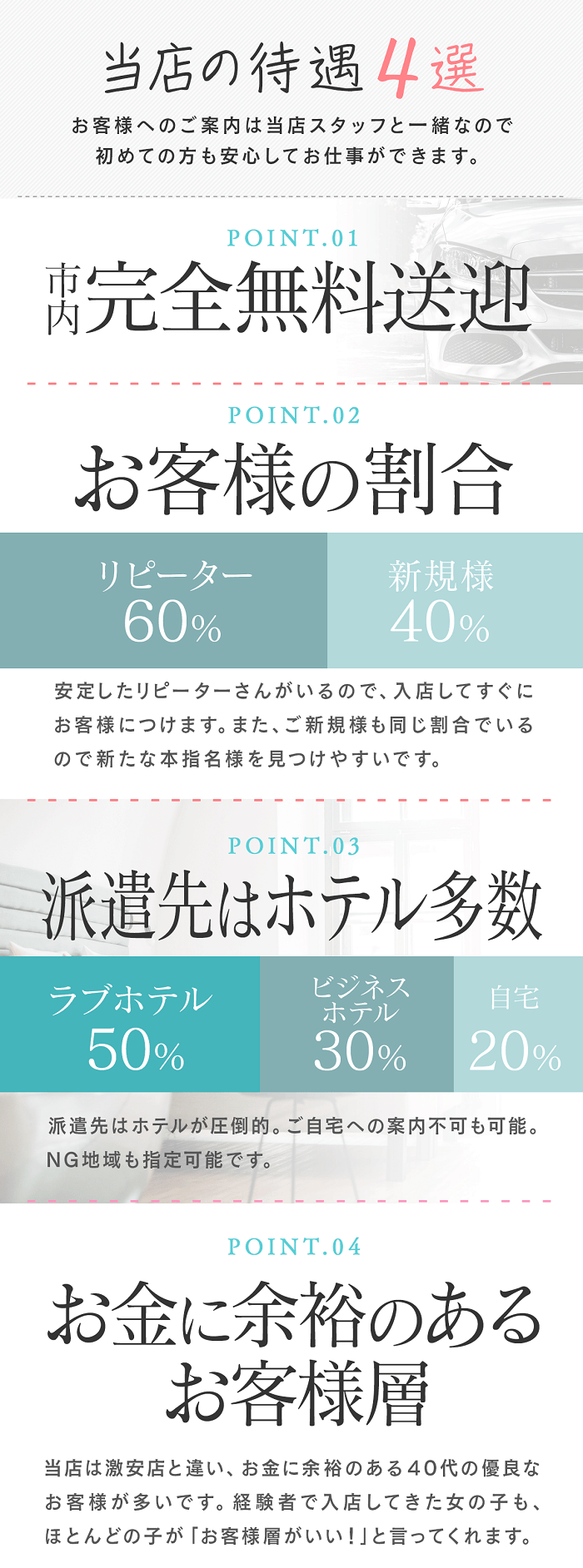 副業やWワークを歓迎しているお店だよ。時間が許す限りガンガン働いていお金を稼ぎたい女の子にはありがたいよね。シフトの入れ方にはお店ごとに決まりがあるから、詳しい条件は問い合わせてみよう♪