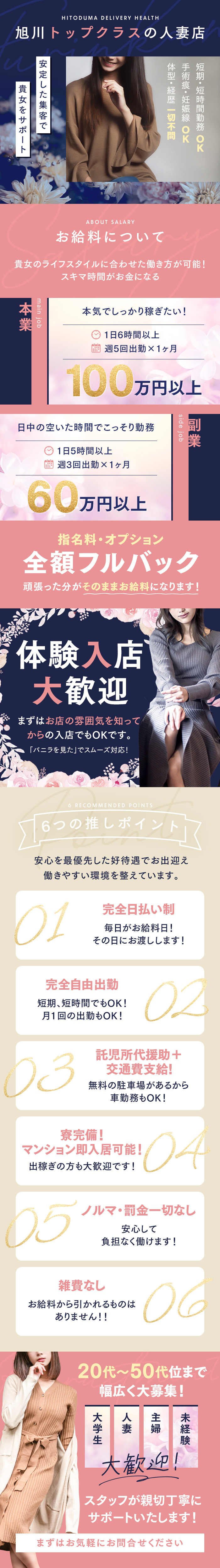 今を頑張る20代~40代の貴女の目標や夢を現実にします!・1日にもらえるお給料が心配な方即日体験も大歓迎です!1日体験から始めてみませんか?もちろん、お給料は完全日払いです!・1人で応募するのが不安な方未経験の方は特に1人だと不安ですよね。当店は、お友達同士でのご応募も大歓迎です!貴女のライフスタイルに合わせて自由出勤で勤務できます!決して容姿やスタイルではないですよ♪・アリバイ対策万全このお仕事をされている方の殆どは家族・彼氏・知人に内緒でバレたくないという気持ちでお仕事をされていると思います。心配な事、不安な事はお店選びから働いて辞めるまで絶えないものです。心配な事や不安な事はその時に解決しなければなりません。当店スタッフが力になります!なんでもご相談ください。当店で空いた時間を有効利用しお財布を重たくしてみませんか?お気軽にお問い合わせくださいねお問い合わせ方法LINE応募も可能ですお電話:08055817895ライン:asahikawafurinkanこちらでも対応しておりますので気軽にどうぞ!