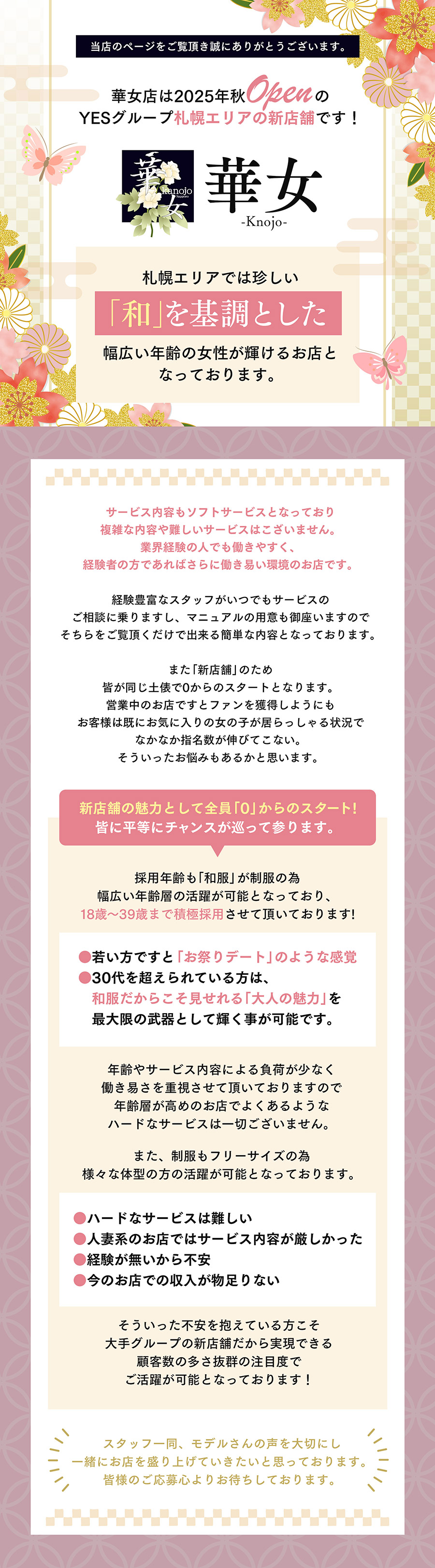 ☆2026年も集客力に自信あります☆ すすきのでもトップクラス! 人妻店ではトップクラスのお給料! ☆YESグループ札幌エリア№1の来客実績 ☆2023年から来客数グループでトップクラス! ☆安心・信頼20年目の営業実績♪ ☆優良会員様100万人以上♪ ☆経験者・未経験者・出戻り・移籍大歓迎♪ ☆出勤調整ありません♪ ☆体型・容姿に自信が無くても安心して下さい。 ☆ご家庭優先・お子さんがいらっしゃる方も多数在籍中 ☆傷跡・タトゥー・妊娠線があっても安心して下さい。 ☆片番平均3万円~5万円稼げてます♪圧倒的に稼げるお店! ☆過剰サービス・ハードサービスは一切ありません! ☆客層の良さが売り 顧客管理を徹底してるため、マナーが悪いお客様は即出禁 NG対応も素早く対応致します! スタッフ一同。全力でフルサポート致します。 一人で悩まず一緒に解決をし楽しく稼ぎましょう♪ 是非お気軽にお問い合わせ下さいね!