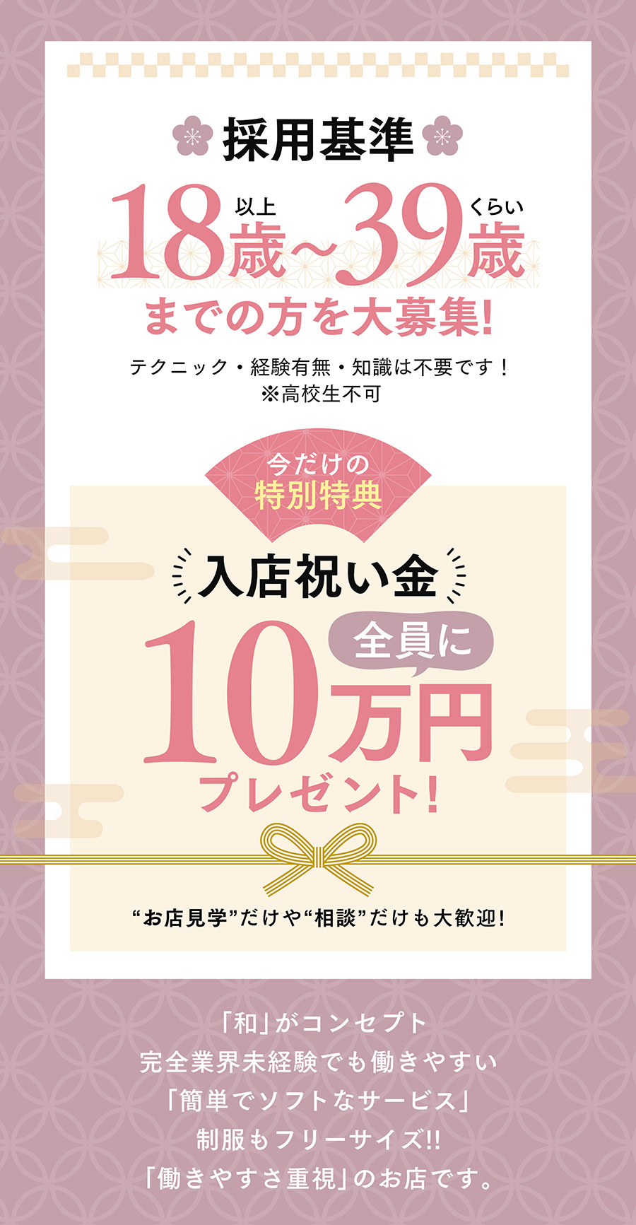 業界最大手イエスグループの【オトナ女子専門店】となります。 2025年4月にオープンしてあっと言う間にグループトップクラスの来店数の超人気店舗となりました。 来客数が多い=接客チャンスが多い=稼げます。 “若さ”じゃない、“大人の魅力”で選ばれる時代 『40代50代の女性が最も輝けるお店』がコンセプトです 週間保証を採用の方全員につけさせていただいております。 ※出勤日に応じての週保証となります。 難しいサービスはなく 未経験の方や十何年とブランクがある方も すぐに始めれる内容にさせて頂きました。 当店独自のマニュアル(ファイル)も ご用意しておりますので不安な方はそちらを見ながら復習すれば すぐにお客様の満足を勝ち取ることが可能です。 店内フルリニューアル済みとなりましてお店の内装も非常にキレイです。 更にきれいな好きなスタッフが毎日清掃を行っておりますので、 ホコリ・カビは一切ございません。 衛生面にも一番気を使っておりますので 安心してお仕事ができる環境を作っております。