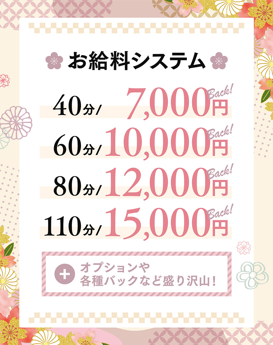 お仕事した時の自分へのバック率が70%以上のお店だよ♪[売上の総額から◯%バック]や[オプションは◯%バック]などの詳細はお店によってちがうみたいだから、バック率のシステムによっては大きく収入が変わる場合もあるから、しっかり確認をしてみよう!