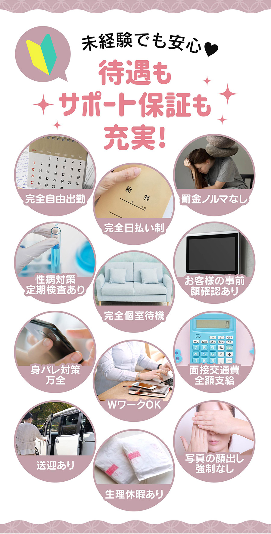 副業やWワークを歓迎しているお店だよ。時間が許す限りガンガン働いていお金を稼ぎたい女の子にはありがたいよね。シフトの入れ方にはお店ごとに決まりがあるから、詳しい条件は問い合わせてみよう♪