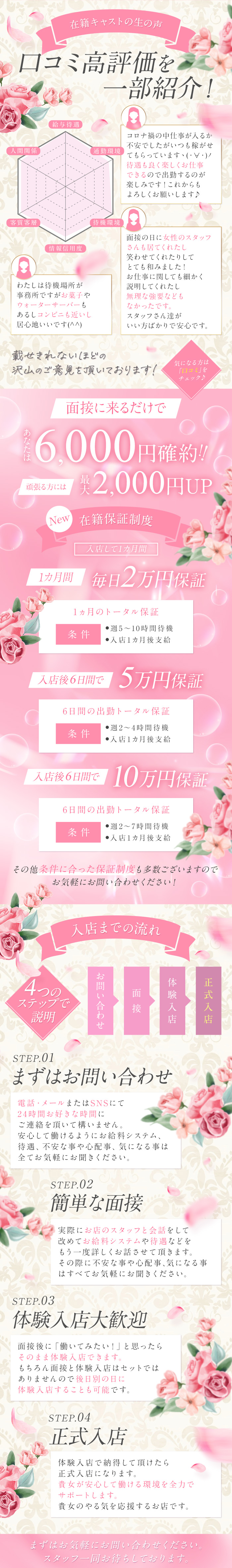 お客様が全然付かなかった場合でも一定の金額分をお店がお給料として保証してくれるシステムだよ♪「全然稼げない!」という心配がないから嬉しい待遇だね!お店によってルールに違いはあるみたいだから詳しく聞いて確認してみてね☆