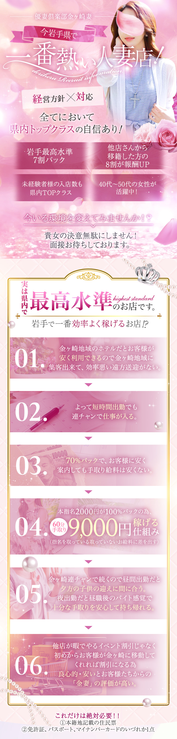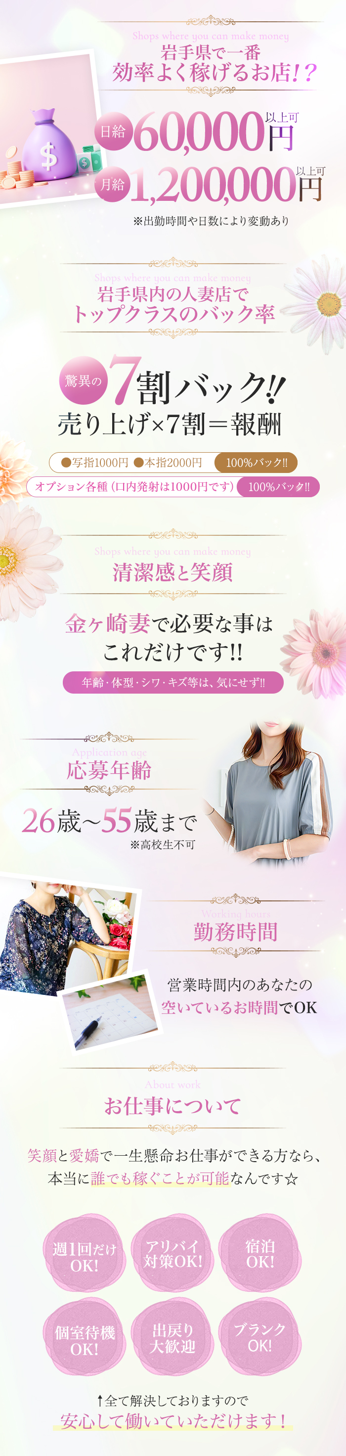 高額バックで稼げる金ヶ崎妻報酬額の実例をご紹介!!短い時間で効率良く稼いでる経験者A子さん出勤帯10:00〜14:00出勤時間4時間70分(フリー)×1 ¥870080分(本指名)×1 1110090分(本指名)×1 12500日給32300週5出勤で161500月20日出勤646000長い時間でしっかり稼いでる経験者B子さん時間帯11:00〜 18時00出勤時間7時間60分×2(本指名)18000120分×1(本指名)16000180分(本指名)×1 24400日給58400週3出勤で175200月12日出勤で700800他店様で現在くすぶってる経験者の方!!金ヶ崎妻で新規一転頑張って一緒に稼ぎませんか!!新人期間はもちろん!!2ヶ月目、3ヶ月目も継続して満足して頂ける報酬額を得る事が金ヶ崎妻では可能です!!まずは一度お話し聞くだけでも構いません(^-^)!!当店はリピーターのお客様が多くやる事をしっかり徹底してすれば必ず貴女に返ってきます!!平日の昼間しか働けない女性やお仕事帰りの短時間しか働けないOLさん、お子様の送り迎えがある主婦の方やシングルマザーで頑張ってるママさん、午前、昼間の時間帯や夜のみの短時間で効率悪い移動時間もなく報酬額も満足していただけるかと思います!ご自分のペースで目標金額稼げるようにしっかりサポート致します(^o^)