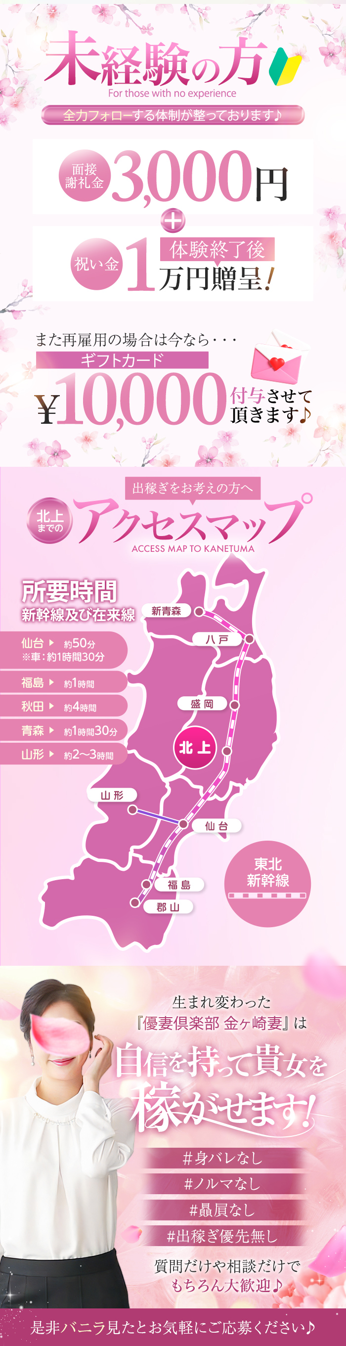 風俗(デリヘル)のお仕事経験のある方も、ない方も。自分に出来るかな?今の環境を変えるのが不安面接に行くのが怖いこのお仕事を選んで本当にいいのかな?面接を決めるまでには、様々な葛藤や不安があると思います。お店の求人ページを見たり、求人ブログを見たりしながら、悩んだり考えたり。「1~2ヶ月くらい悩んでいました」という女性は沢山いますし、中には半年以上悩んで…って方もいます。ですが、皆さん面接でお話しした後は意外と・・・想像と良い意味で違いました!もっと早く来ればよかった!私にも出来るかも!と言われる方が多いですご自身のことですので、ゆっくり考えてから決めることも大事だと思います。でも、まず話しを聞いてみて、それから悩んでみても遅くはないと思います金ヶ崎妻では「デリヘルで働いてみようかな?」「とりあえず話しだけ聞いてみたい」という方のためにお話しだけ制度を設けています。気になることを質問したり、相談だけでも大丈夫です。話しを聞いてみて、「私にはこのお仕事は無理そう」と思えば、やめる。「私にも出来そうかも」と思えば、やってみる。を判断するのもひとつの方法だと思います皆さんも、悩むその前に。お話しだけでも聞きに来てみませんか^^?