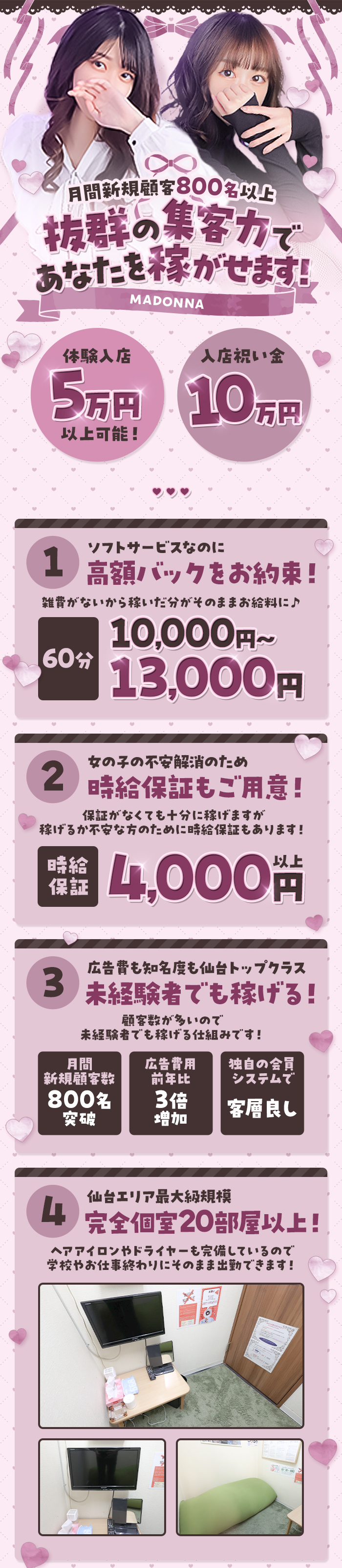 当店は女の子に稼いでいただくことはもちろんですが、事務所の環境や待遇にもこだわりを持っています。広々とした個室の待機スペースや、居心地のいいい喫煙ブースを完備するほか、エステや美容室との提携、美容整形手当の支給を実施。もっとキレイに、そして自分らしく働けるように、お手伝いさせてください!