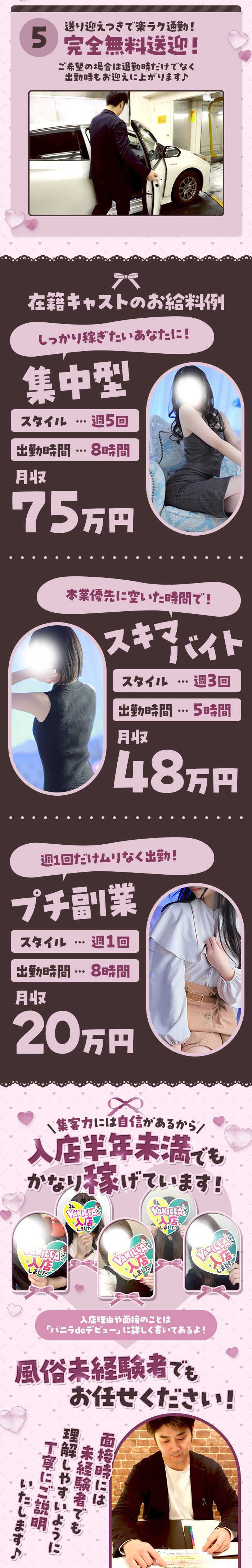 勤務形態、露出条件、SNSなど条件によってもっと高額な保証もご用意!確実に稼げる自信があるからオーダーメイドで選べます!