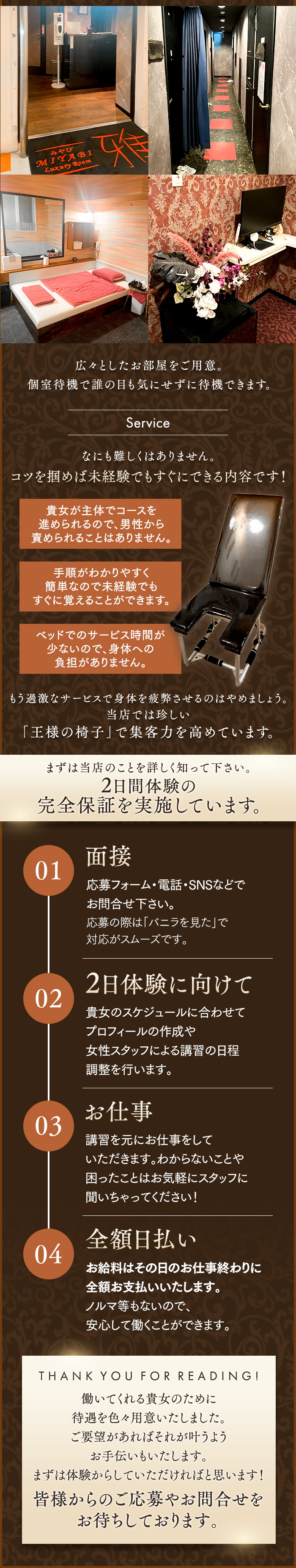 難しいテクニックは必要なし!安定の集客力で安定の高収入!同店の特徴の1つは“王様のイス”を使ったコース。難しい技術を求められないほか、主に女性が主導となり心身の負担を抑えられる点も魅力だそうです。また取材した“リー”さんいわく「サービス内容はお客様からも非常に好評で、リピーターの方も多いです」とのこと。集客力が安定しているため収入面もバッチリなのだとか。