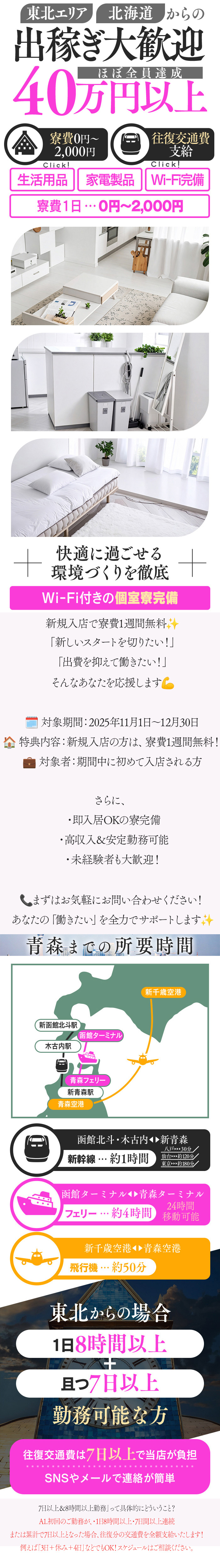 「通うには遠いな~」とか「引っ越ししたいな~」そんなときでも、お店が契約しているマンションを寮・宿泊施設として用意をしてくれるよ☆だから面倒な手続きもないし、家賃が無料や格安で、支払いも給料引きだったり融通が聞くから、必要な人は詳しく聞いてみてね♪