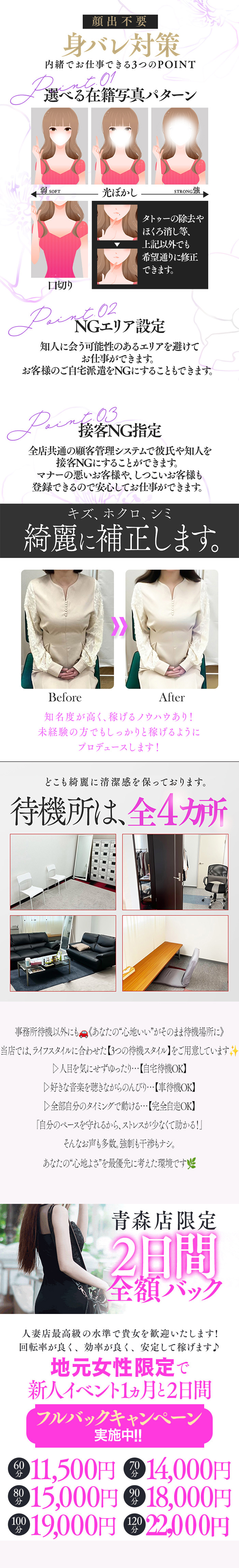 ◆青森の業者と付き合い一切なし! 【未経験安心スタート♪】 ★写真を載せなくても1日平均4.5本 ★身バレ・知人バレ“0”の実績! ◎写真加工専門のプロwebデザイナーが あなたをプロテクトします。 ◎モザイク写真でも掲載を気にされる方には 写真掲載なしでも充分稼げます。 ◎利用者を判別できる顧客管理システムは 業界最高レベルのシステム。 【人目に付きやすい青森市で自宅への派遣は一切しておりません。】 ・社用車にて送迎スタッフが案内致します! ◆桃屋は安心・安全の法人経営。 『風俗ってなんだかこわい、怪しいな』 を払拭したクリーンさが自慢です!