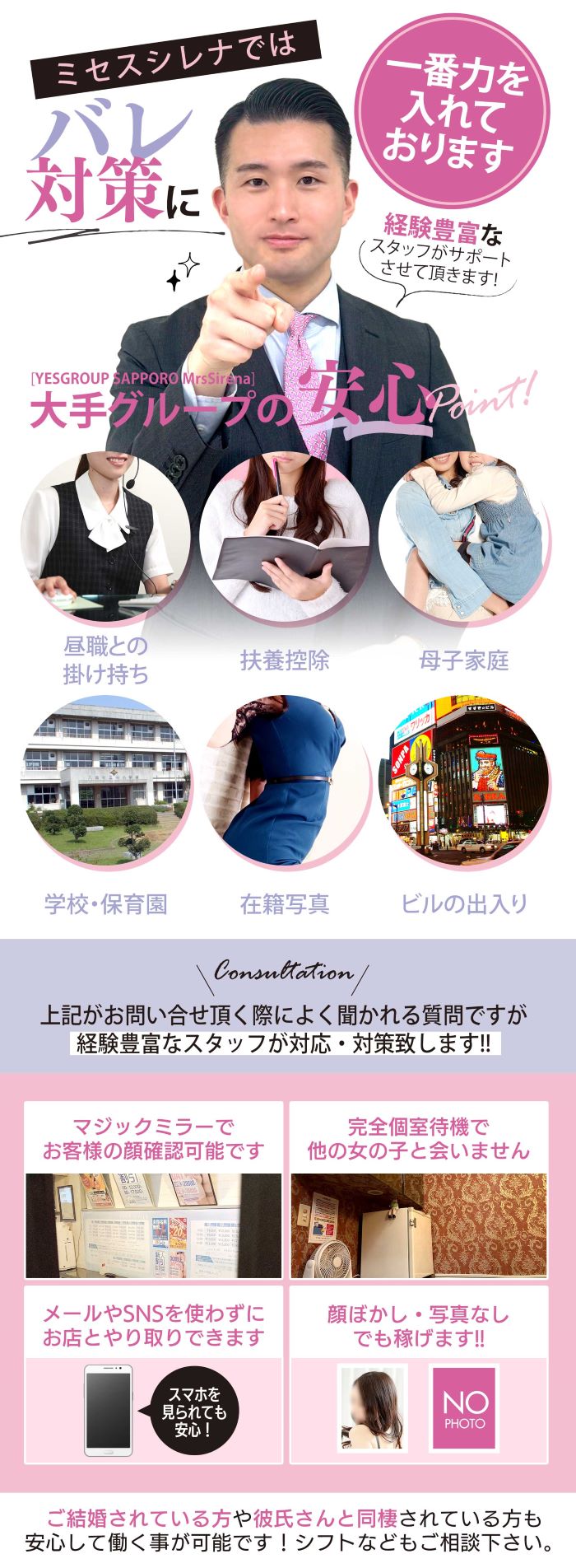 このお仕事をしていることが家族や知人にバレないようにしてくれるシステムだよ!対策方法はお店によってちがうみたいだけど、普通の職場で働いているふりをして電話に取り次いでくれたり、給料明細の発行社名を変えてくれたりなどの対策をしてくれるよ♪