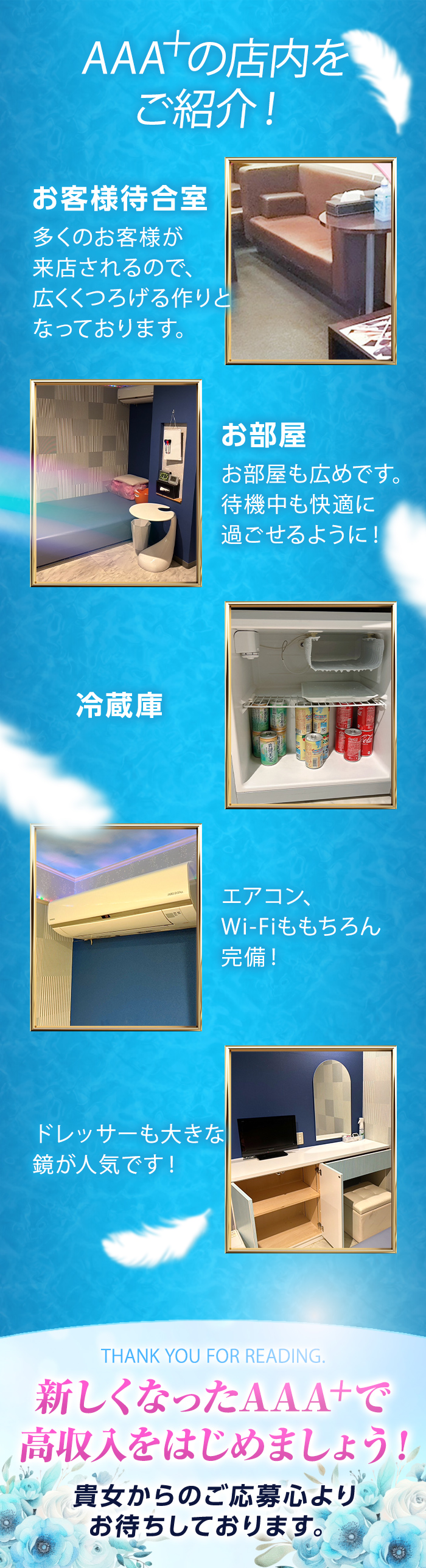 大手グループが経営しているお店だよ。待遇や条件も手厚くて安心だし、集客力もあって女の子が稼ぎやすい!待遇や条件はグループの中でも店舗ごとに変わってくるから、気になるポイントは問い合わせて聞いてみよう♪