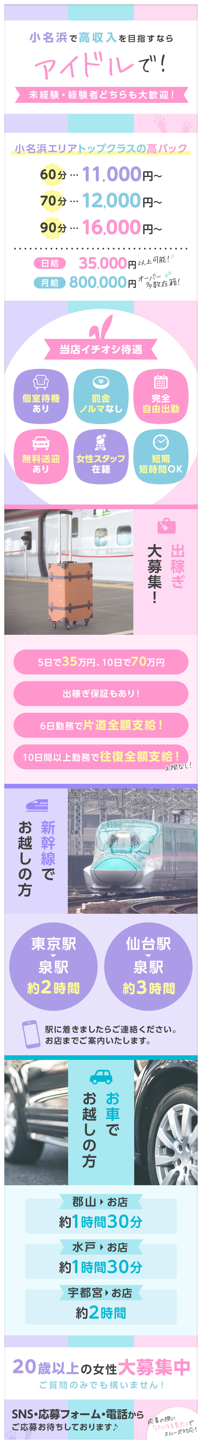 数あるお店の中から、アイドルの求人情報をご覧いただき、誠にありがとうございます!お店によっては遅刻や早退、当日欠勤やノルマに罰則が発生することがあります。いわきの老舗店で安心安全の当店では、そのようなことは一切ございません。また、完全自由出勤制を導入しているので、ご自分のペースに合わせて働けちゃいます。1日3時間でも、月に1~2回でもOKです。つまり、学校帰りやお仕事帰り、予定の合間などのスキマ時間に効率よく稼いでいただくことが可能なんです!逆にガッツリ出勤して、できるだけ稼ぎたいという方の要望にもお応えできます。ご不明な点・不安な点などは、どうぞお気軽にお問い合わせください。自由なスタイルで働きましょう♪