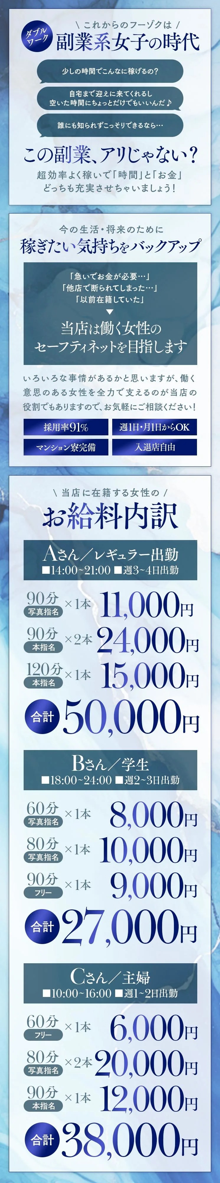 副業やWワークを歓迎しているお店だよ。時間が許す限りガンガン働いていお金を稼ぎたい女の子にはありがたいよね。シフトの入れ方にはお店ごとに決まりがあるから、詳しい条件は問い合わせてみよう♪