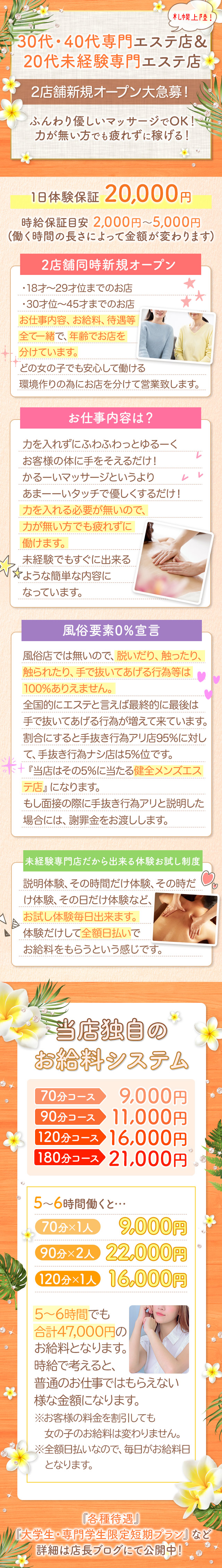 マッサージと聞くと大変そうなイメージがありますが、当店は未経験専門店なので力が無い方でも疲れずに出来る内容になってますのでご安心下さい。