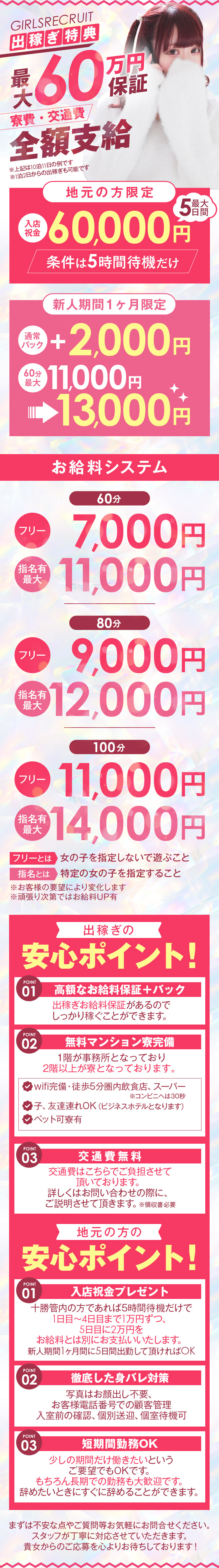完全日払い制 【コースバック】 60分:7,000円~9,000円 80分:9,000円~10,000円 100分:11,000円~13,000円 120分:13,000円~15,000円