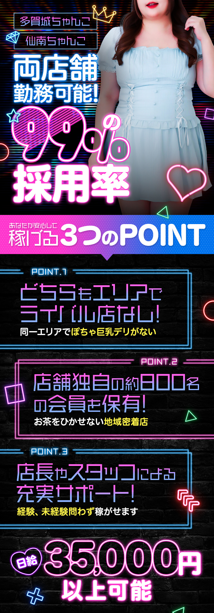 大手グループが経営しているお店だよ。待遇や条件も手厚くて安心だし、集客力もあって女の子が稼ぎやすい!待遇や条件はグループの中でも店舗ごとに変わってくるから、気になるポイントは問い合わせて聞いてみよう♪